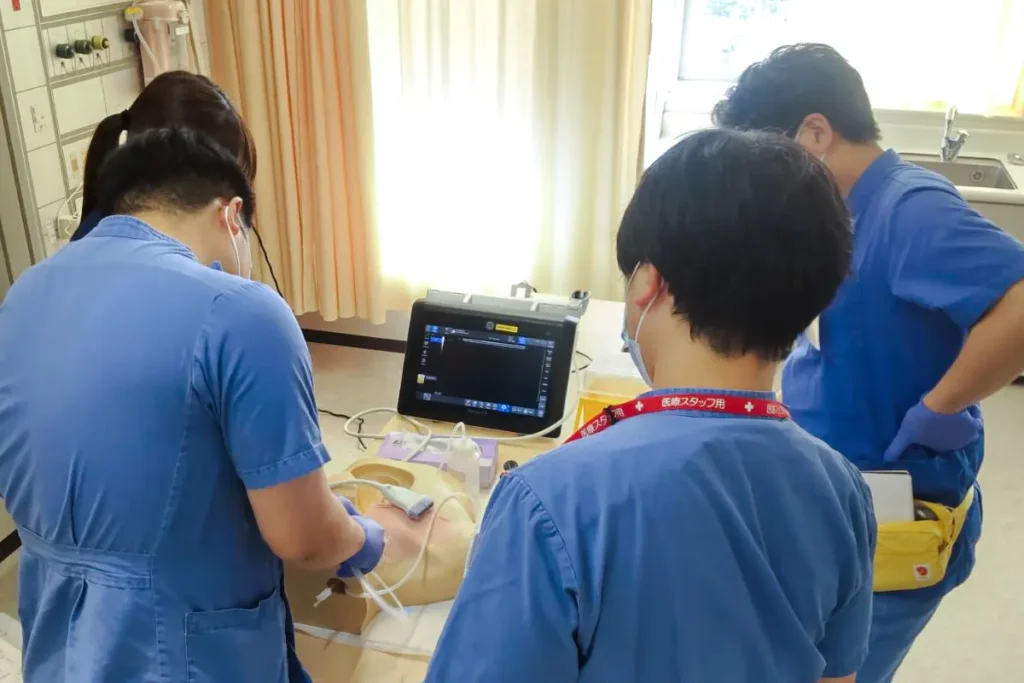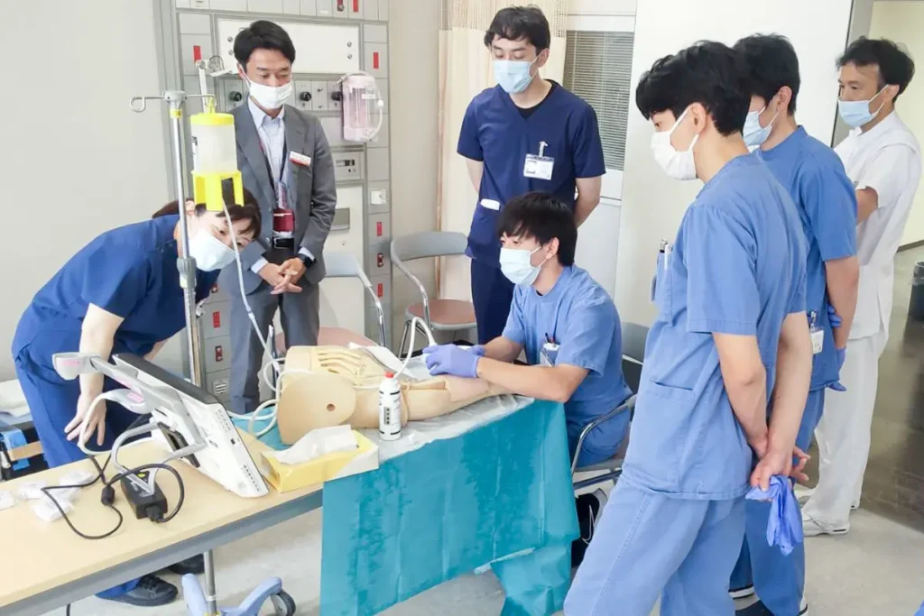 ご覧の通り青いスクラブ(救命センターの制服)の集団で溢れかえっていますが、当院が院外研修医を多く受け入れているためです。救命センター以外でも、院内外研修を問わず血管内カテーテル手技に自信の無い方は随時参加可能です。人財育成センターでは、知識だけではなくこうした医療技術のサポートも行っています。