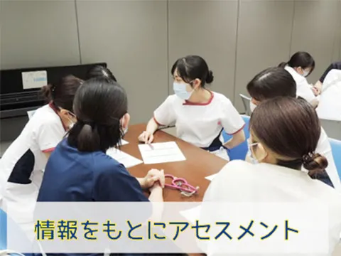 研修では、アドバイザーが指導者役と患者役を兼ねて、6人前後のグループで症例の基本情報をもとに観察ポイントを話し合いました。その後、患者役に対してイグザミネーション(身体診察)を実施し、得られた情報をもとにグループでアセスメントを行うという流れで進めました。