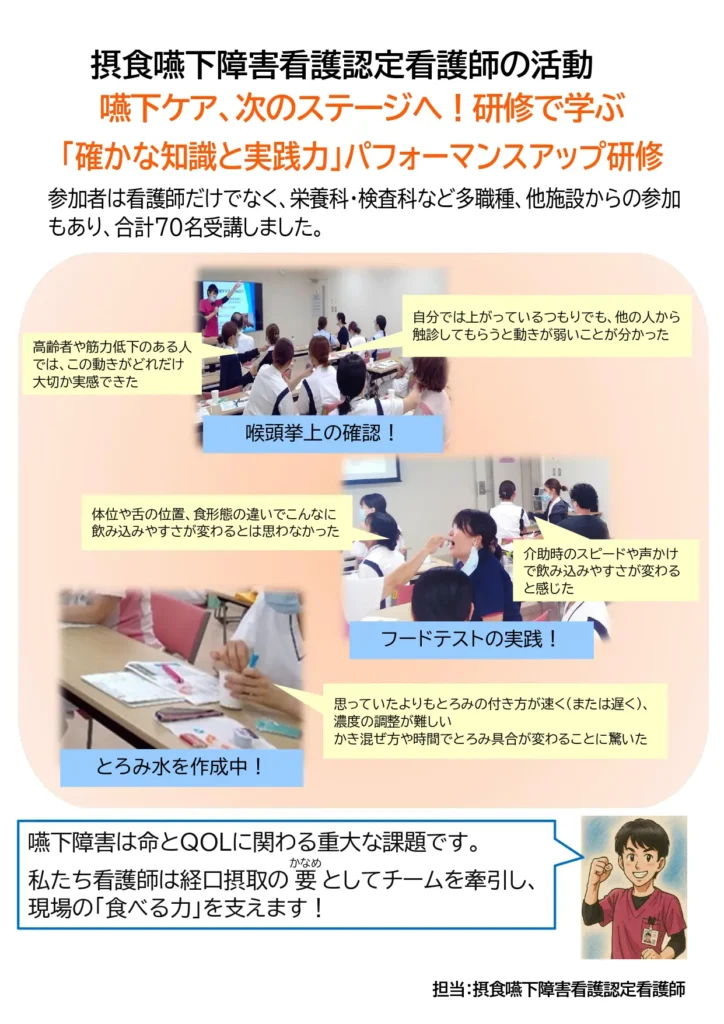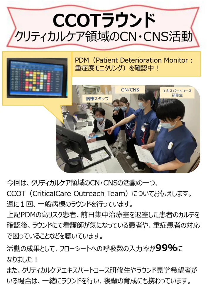 さらに、多職種と連携したカンファレンスやコンサルテーションを通して、現場の課題解決やケアの質向上に取り組んでいます。日々の取り組みや専門・認定看護師の活動を順次ご紹介していきます。