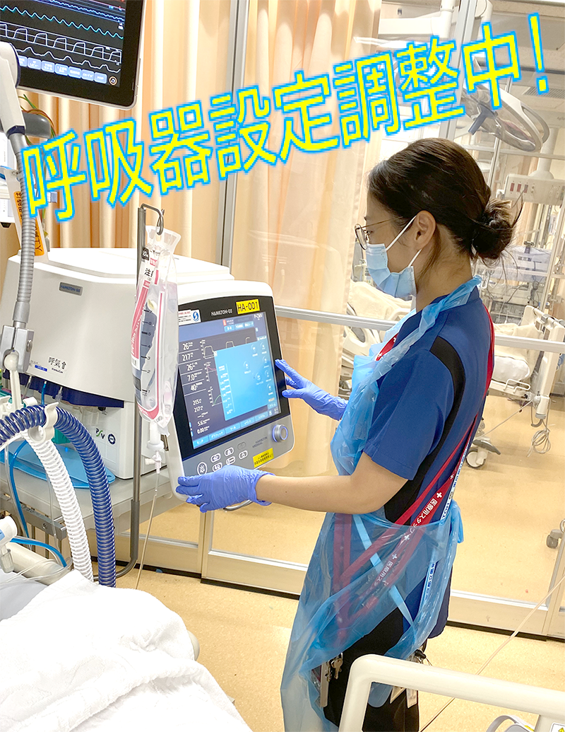 人工呼吸器を使用している患者さんが多い当病棟では、呼吸器との同調がうまくいかない場面や、状態変化に応じた設定変更、離脱に向けた調整など、特定看護師が医師の指示や指示書に基づいて対応しています。
