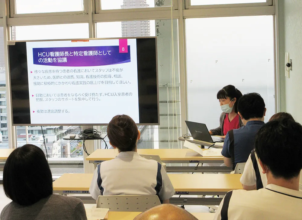HCUでは、スタッフに対して患者の病態変化のアセスメントを思考発話で共有し、回復につながるケアについて対話を重ねています。急変時には担当看護師をサポートし、タイムリーなリフレクションを行うことで実践能力の向上につなげています。